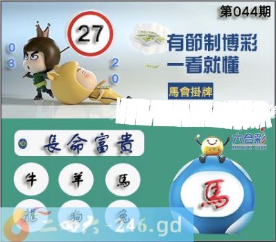2025044期2025年044期正版彩图挂:27 爆:马 挂牌成语:长命富贵 挂牌出肖:牛羊马龙狗兔