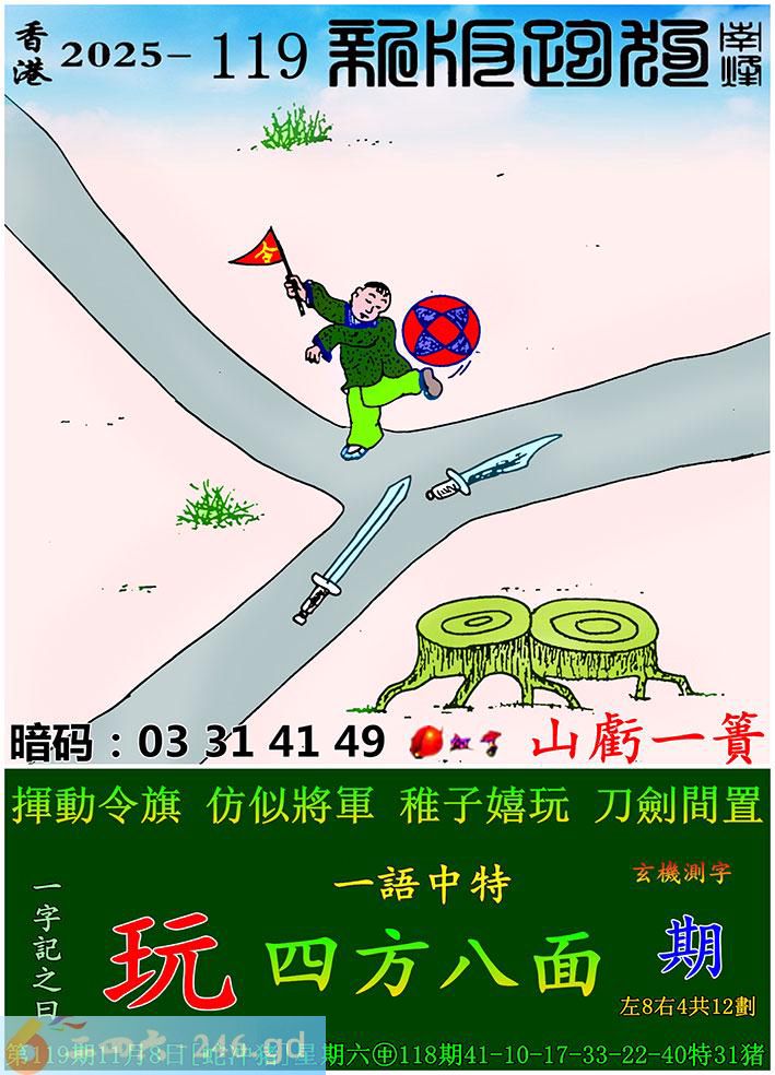 119期跑狗一字記之曰:【玩】 揮動令旗,仿似將軍。 稚子嬉玩,刀劍間置。 玄機測字:《期》 一語中特:四方八面
