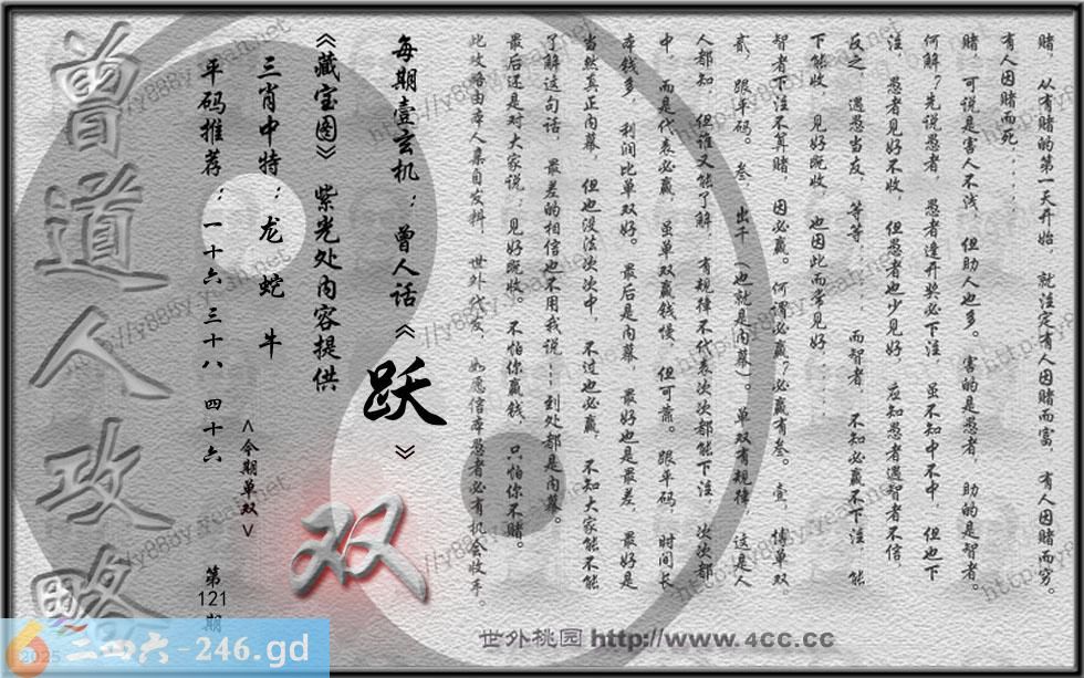 121期藏寶圖 新:未知太保李公谁 老:起犯春霜壹泾寒 禁:马禁:3尾玄機字:《跃》