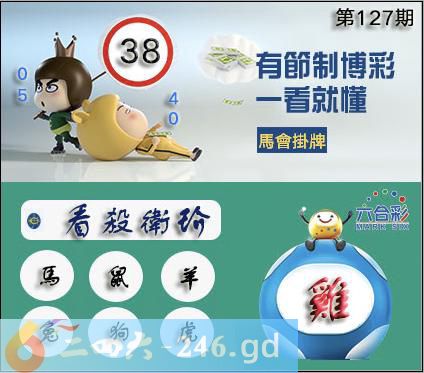127期正版彩图挂:38 爆:鸡 挂牌成语:看杀卫玠 挂牌出肖:马鼠羊兔狗虎