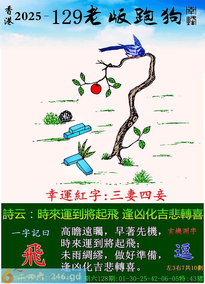 本帖最后由期望于2025-12-1316:59编辑 129期老版跑狗一字記之曰:【飛】 詩雲:時來運到將起飛,逢凶化吉悲轉喜。 高瞻遠矚,早著先機,時來運到將起飛; 未雨綢繆,做好準備,逢凶化吉悲轉喜。 玄機測字:《逗》 主一笑猴才对